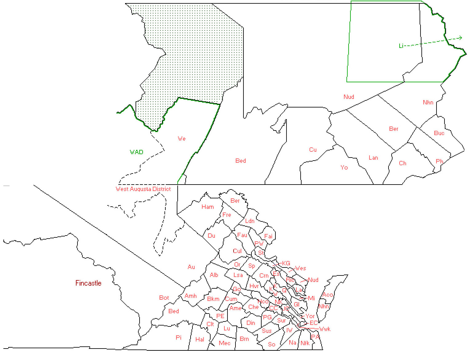 1773, Oct 11 - WEST AUGUSTA DISTRICT created by Virginia from AUGUSTA. WEST AUGUSTA DISTRICT overlapped territory claimed by Pennsylvania. (Abernethy, 94) Map: Pennsylvania/Virginia Map 1773 - 1776, showing land which was in dispute between the two states.