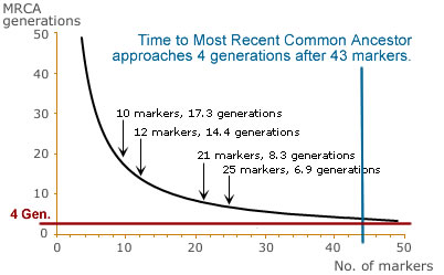 Always, the first feature to focus on is to see that the cousins from each ancestral line match up with each other. Each yellow circle in the network diagram represents one or more participants with matching DNA test results. Three of the participants in the large yellow circle have been tested on fewer markers than the typical 43 markers that we have been using for this project, but on the markers tested, there is an exact match. The participant id, is the number 001-018 for the participants. The family line that the participant comes from is represented by the color coded abbreviation in front of the participant id. The black codes, on the lines connecting the yellow circles, are the DNA test markers that show differences when making a comparison between two or more people. Since none of these participants differ by more than three markers, they all, very likely, share the same recent common ancestry, which is Herman Groethausen born about 1670 in Germany or a close ancestor of his . The largest yellow circle is the group that is represented by participants 001, 004, 005, 006, 013, 016, and 018. This group has the largest number of participants with identical test results. They all have exact matches on all markers tested. They represent the lines of: John Greathouse and Sarah Mc Dade; Jacob Greathouse of Georgia; Michael Greathouse and Debbie Snawder; Herman Groethausen, and a Greathouse Orphan. The test results of these people are currently considered to be the ‘ancestral haplotype’1 – the haplotype that defines the family line, because it is the largest group with identical test results. We would like to have at least two and up to four participants from each family group in order to firmly establish Herman Groethausen’s haplotype. From each line, at least two participants are needed. Non-paternity events (i.e., adoption, infidelity, etc.) occur at about 2-5% every generation, so having two or more participants per line is vital to ensure that the correct haplotype is obtained for a particular family line. As a general rule, the further back the common ancestor, the more participants are required. Participants 009 and 011 are both documented descendants of Herman Groethausen. They both differ by one marker from the ‘ancestral haplotype’. If the ‘ancestral haplotype is correct for Herman Groethausen, then somewhere between Herman and participant 009, a mutation occurred. If we had more cousins related to participant 009, we might be able to locate the ancestor where the mutation occurred. The same is true for participant 011. Participant 010 and 008 also differ on one marker each from the ‘ancestral haplotype’. Again with enough participants, we might be able to determine the ancestor where the mutation occurred. The same is true for participant 007. Participant 003, shares the S456a mutation with participant 007, but participant 003 shows two additional mutations. Participant 003 is a documented descendant of Harmon 1750, while participant 007 is a documented descendant of Harmon Greathouse 1787. It has been considered that Harmon 1750 might be the father of Harmon 1787. While they share the S456a mutation, the descendant of Harmon 1750 has two additional mutations that do not show up for Harmon 1787, as one would think they should if they are indeed father and son. Some DNA projects have hundreds of participants. As you can see, there is a lot more to be learned as we add participants to the project. DNA testing should only be used in conjunction with documented genealogy. Therefore the conclusions drawn are not absolute certainties, but the DNA evidence does give very strong support for the conclusions. These first results from these participants, shows that our genealogy research is on the right track, and that these participants are descended from Herman Groethausen, or a close ancestor/relative of his, even if they can not provide other documentation to prove it. 1 A Y-DNA haplotype is a set of 43